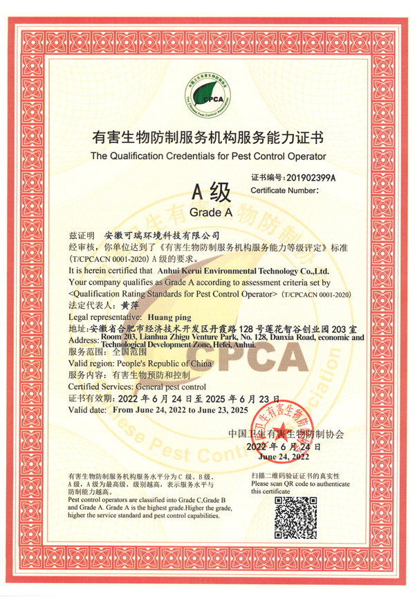 凱瑞蟲控是安徽可瑞環(huán)境科技有限公司旗下品牌,安徽可瑞環(huán)境科技有限公司成立于2014年,注冊資金500萬元,全國A級資質(zhì),致力于蟲害風(fēng)險管理并提供蟲害消殺、防疫消毒、有害生物防制、蟲害控制管理與監(jiān)測、衛(wèi)生防疫消毒、商業(yè)清洗清潔服務(wù)、空氣治理服務(wù)、環(huán)境綠化施工與養(yǎng)護、藥品和器械銷售、技術(shù)咨詢與培訓(xùn)等業(yè)務(wù)的服務(wù)性公司。公司是一家有行業(yè)資質(zhì)、注冊商標(biāo)及專利的公司。我們不參與各種擾亂市場秩序的低價競爭,堅持以合理的價格、新穎的設(shè)備、優(yōu)質(zhì)的技術(shù)、完善的質(zhì)保體系和質(zhì)保措施,來對客戶進行綜合的服務(wù)工作。公司本著...